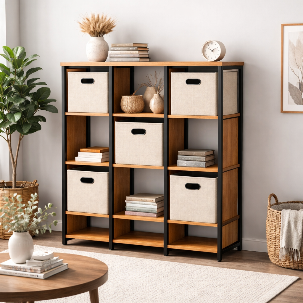 Étagère moderne avec compartiments ouverts et bacs de rangement, idéale pour organiser et décorer votre intérieur avec praticité.